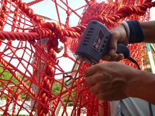 ロープとネットは1本1本、熱で溶かしながら切断しないとたんぶからほつれてしまうのです。