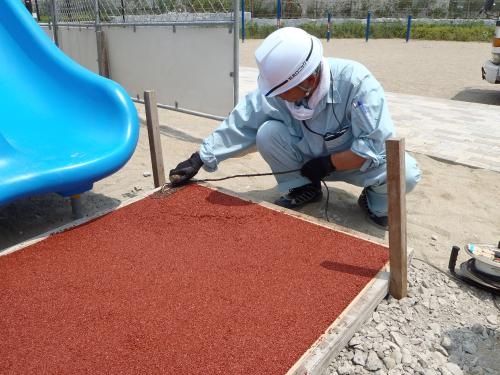 宮城野区の新しい公園に設定された滑り台に安全の為にゴムマットが設置されました。