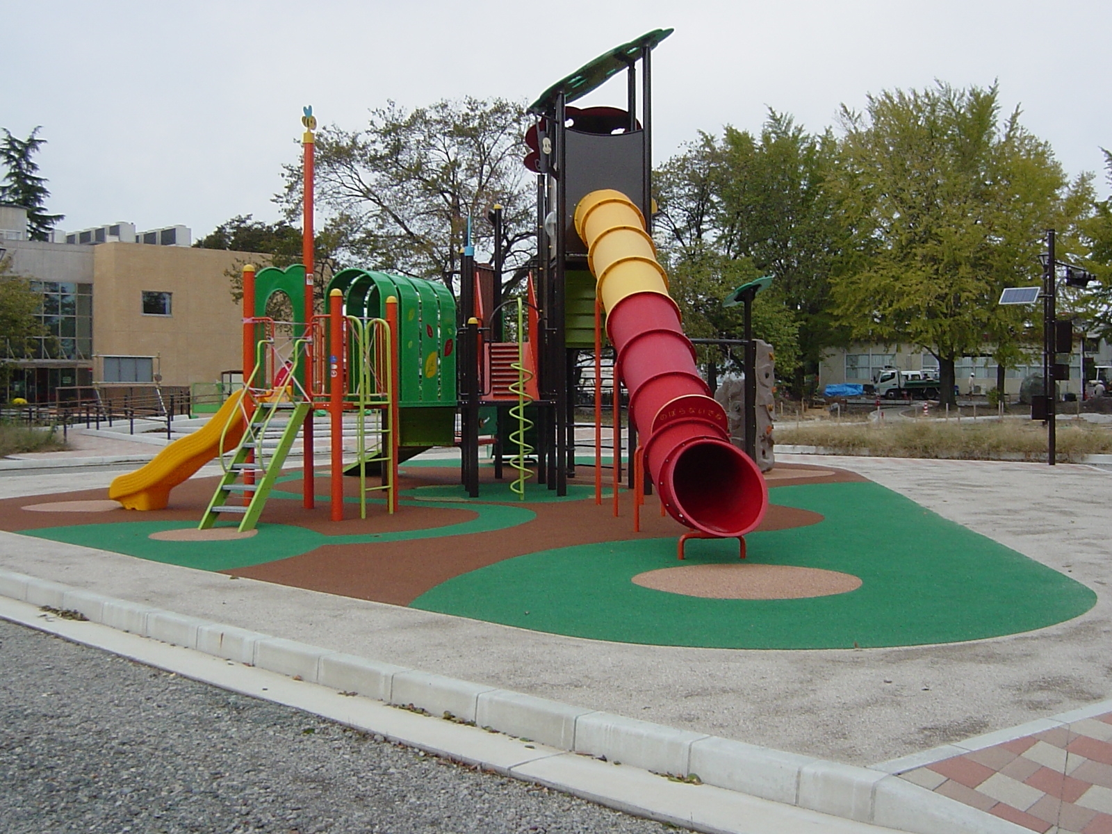 最近は、子供の安全を重視し、遊具の安全領域内をゴムマットで敷設し、安全を確保している自治体が大変増えています。