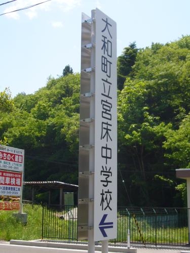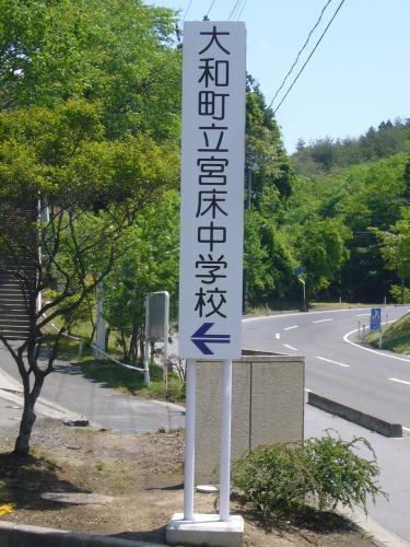 宮城県黒川郡大和町の宮床中学校の入口に建つ施設名称案内標識です。