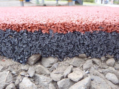 当社オリジナルの緩衝材は柔らかい医療用のゴムチップを使用している為、他社のものと比べて厚さも薄くすることが可能で、しかも現地での施工も可能で施工場所の形状を選びません。