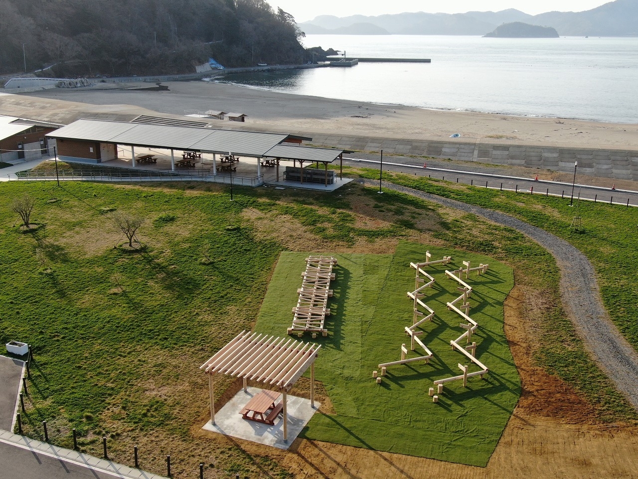 宮城県石巻市北上町十三浜白浜の白浜ビーチパークに木製遊具が完成しました。